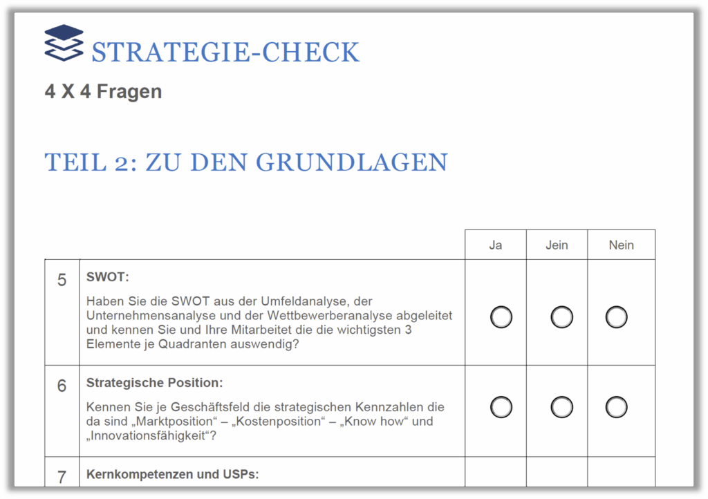Wir haben für Sie eine kleine Checkliste mit 4 x 4 Fragen zusammengestellt, mit der Sie einen ersten Eindruck bekommen können, wie es um die Strategie Ihres Unternehmens steht:
