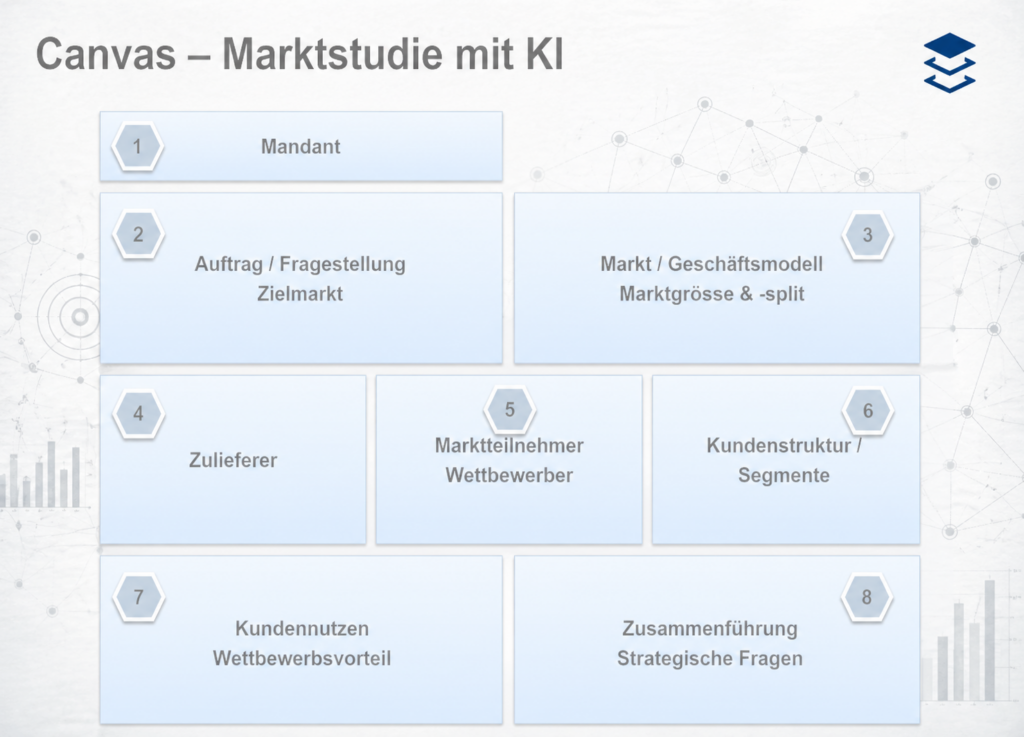 Das Canvas zeigt die acht Bausteine einer vollständigen Marktabklärung. Von der Mandantenerfassung über Markt, Zulieferer und Wettbewerber bis zur Kundennutzenanalyse und den strategischen Fragen. Jeder Baustein hat einen definierten Input, einen strukturierten Output und einen Freigabeschritt durch den Berater.
